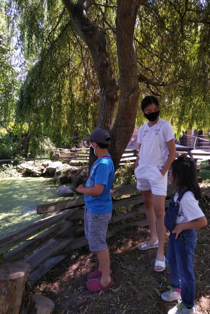 Có 1 cô cầm một cái dây đứng phía trước. Cô ấy dắt con ngựa đi 1 vòng quanh vườn trong trang trại. Ở vườn có cây táo, cây lê, cây việt quất và hoa hướng dương khổng lồ. Có 2 cái nhà cho con ong và 1 cái ao nhỏ. Tôi tưởng nó là 1 cái sân chơi, có 1 tí nước ở bên trên như là nước mưa. Bởi vì nó có nhiều màu xanh trên nó (bèo tấm)