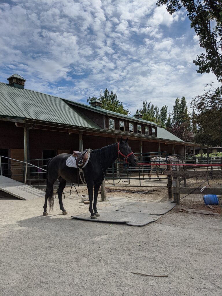 I get to brush the horse so if I have one, I can know how to take care of it. My teacher helps tack up. Then I go in a ring to learn.
