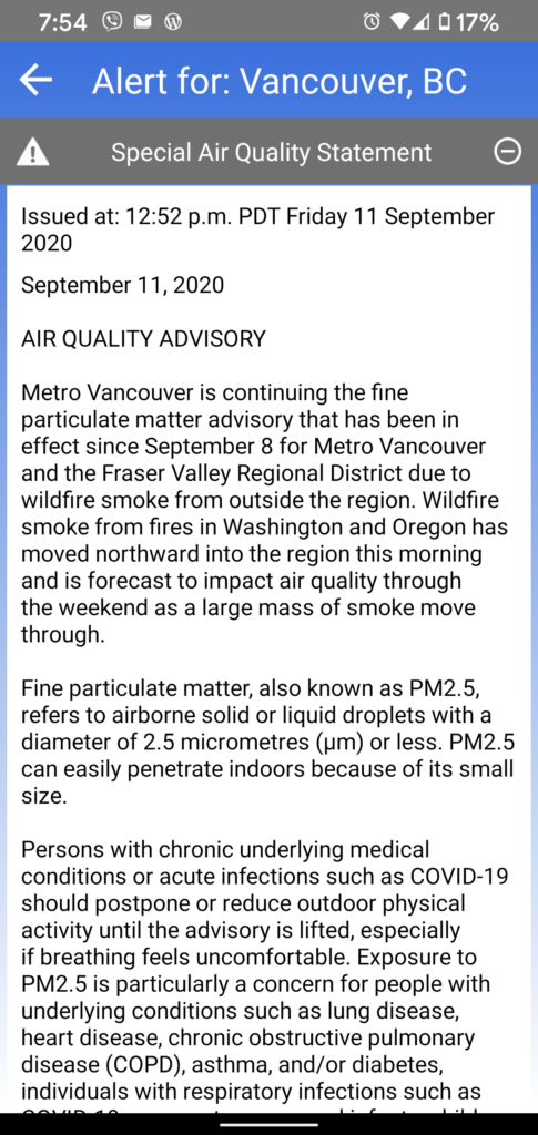 Cập nhật: qua mấy ngày rồi, mọi thứ còn tệ hơn! Rừng bên Mỹ vẫn cháy. Chất lượng không khí ở Vancouver đang ở mức tím và đỏ luôn! Cực kì độc hại và nguy hiểm! :((