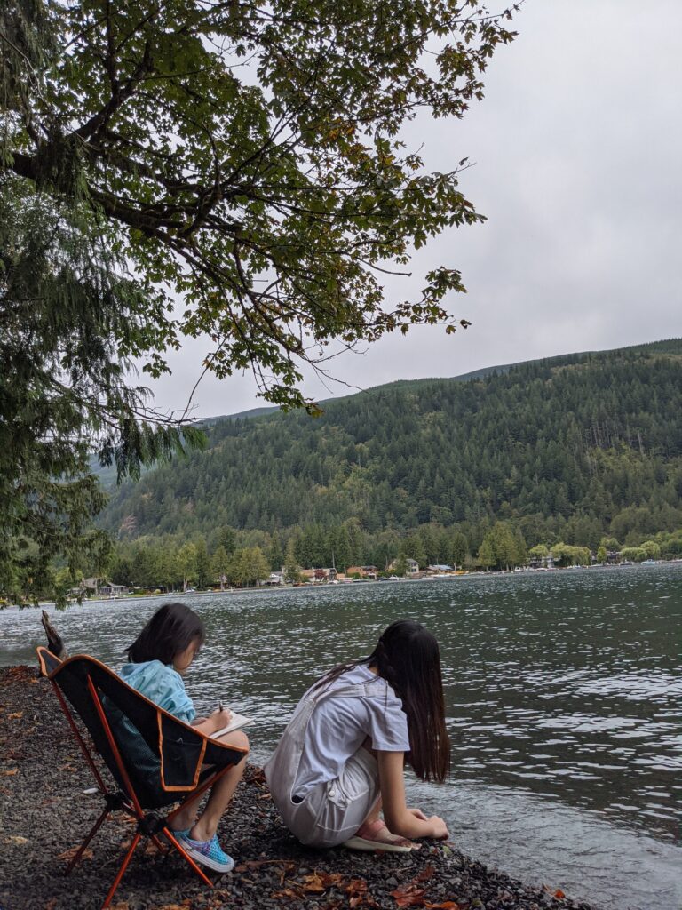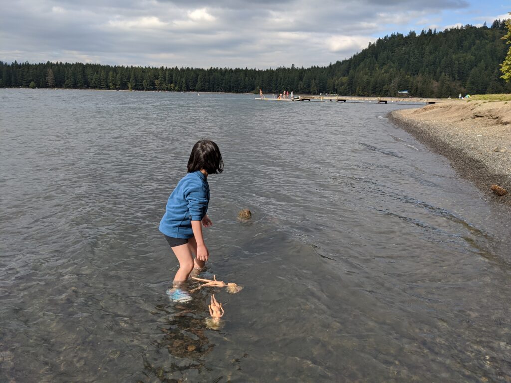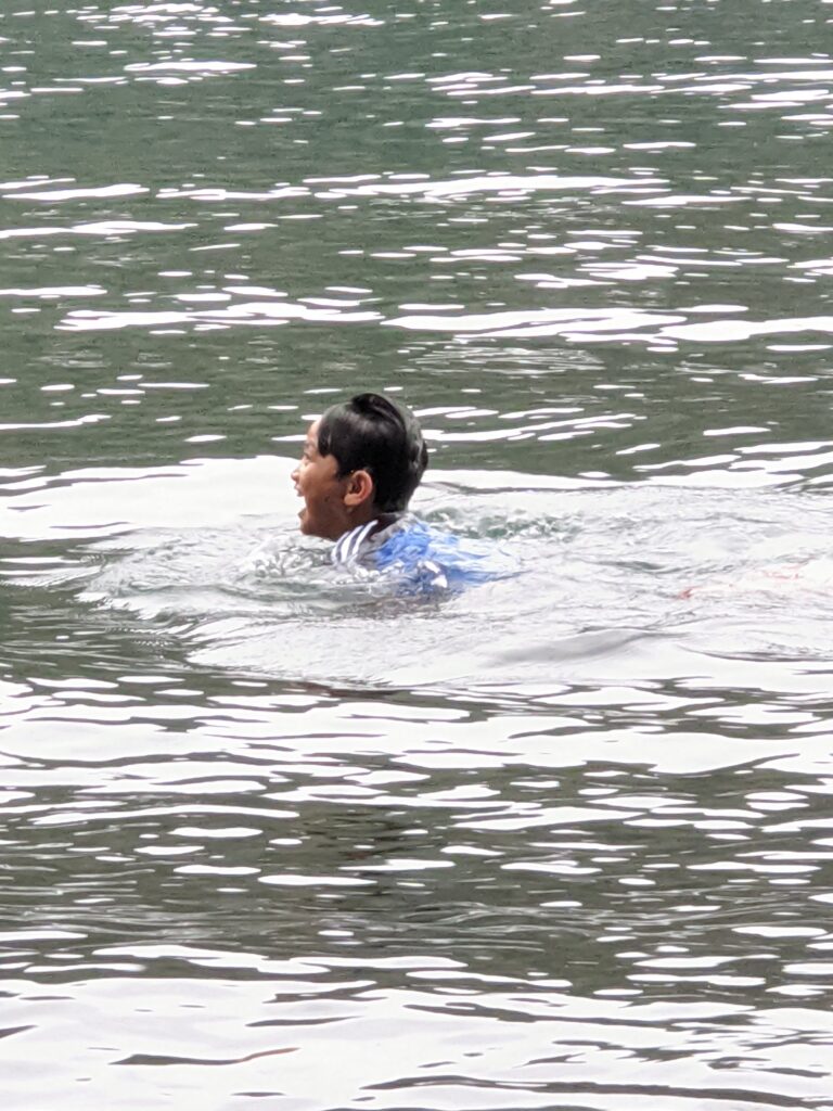 After that, we went to visit the actual Cultus Lake. The water was crystal clear and to my surprise, I wasn’t as cold as I thought. We couldn’t find the beach-ish area so we found a small, isolated area where we had a nice view of the lake. Since mom and dad decided we shouldn’t bring our swimsuits, mom let us swim in our normal clothes! I didn’t want to swim because I felt a bit lazy. Zei, on the other, jumped right into the lake. We also forgot to bring towels with us to the lake so Zei had to walk home cold ?.