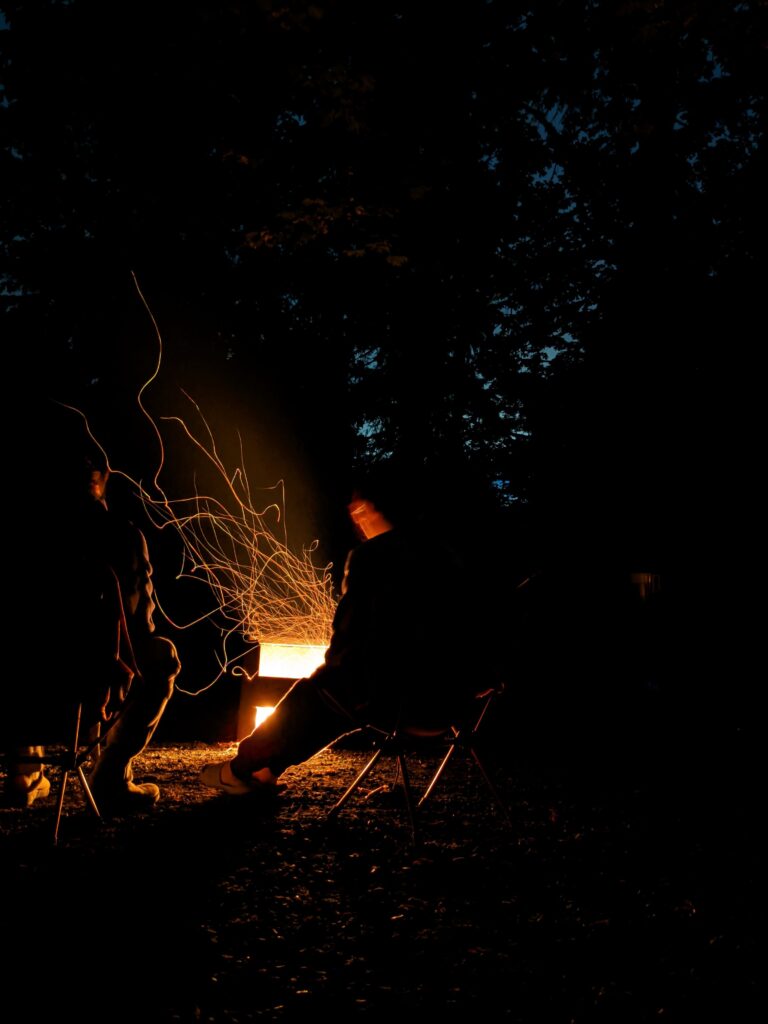 Sau bữa tối, gia đình cô T đi về trước. Chỉ có gia đình tôi ở lại thôi và lúc đấy là lần đầu tiên chúng tôi đi cắm trại một mình. Cả nhà ngồi ở gần cái bếp lửa trại. Không có gia đình cô thật im lặng. Chỉ có tiếng nổ lép bép của những thanh củi cháy. Tôi thấy thật ấm, thật dễ chụi và yên tĩnh. Vì S đang nằm ôm lên tôi, tôi thây ấm hơn (S thành một cái chăn:)) Ánh lửa nhảy nhót bập bùng. Nhìn rất vui mắt.