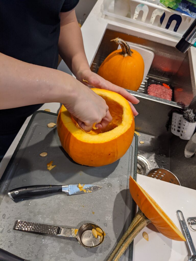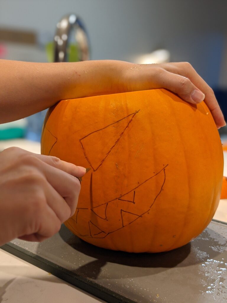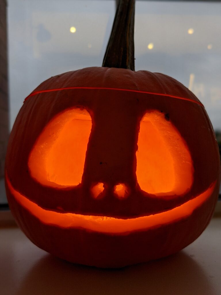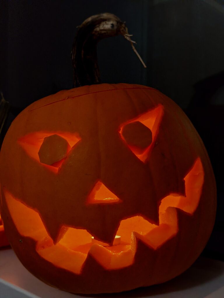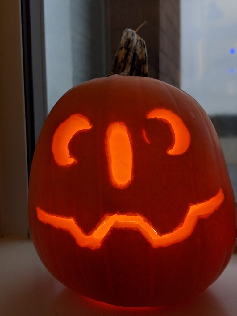 Bố đã giúp lấy cái ruột quả bí ra. Sau đó tôi, S và C vẽ những khuôn mặt chúng tôi thích ở trên vỏ quả bí. Tôi đã vẽ khuôn mặt của logo Godot vì là tôi rất thích làm game và logo của nó cũng là một cái mặt. S và C, um… tôi không biết. Quả của S trông đáng yêu. Quả của C thì trông hơi sợ.