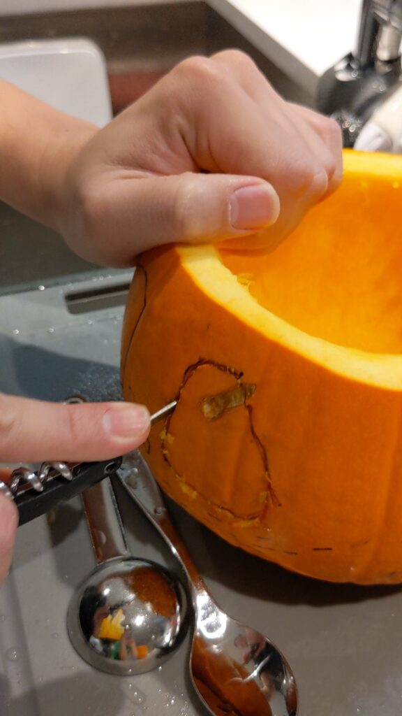 Chúng tôi vẽ xong thì bố đã giúp cắt ra khuôn mặt đó. Cắt gọt xong và tôi đã được bỏ nến vào trong!
