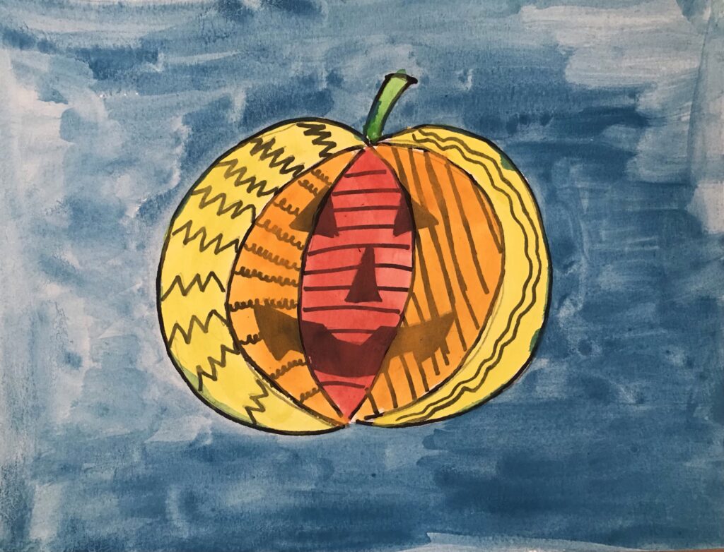 Và hôm nay tôi sẽ mang tới các bạn… Một quả bí ngô!!! Bức tranh này là tác phẩm trong giờ học vẽ của tôi. Tôi vẽ quả bí ngô vì là bây giờ sắp là lễ hội Halloween rồi! Như các bạn thấy có rất nhiều họa tiết và một khuôn mặt rất đáng sợ. Tôi chọn nền màu xanh vì màu xanh là màu đối lập màu cam để cho quả bí ngô nổi bật.