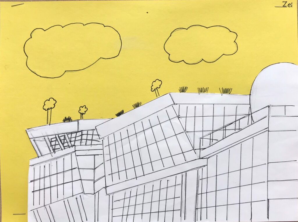 Các bạn thường vẽ tòa nhà cao trên giấy trắng, rồi trên tờ giấy màu vẽ một tòa nhà cao nữa. Tôi thì lại chọn vẽ Trung Tâm Hội Nghị Vancouver, đó một tòa nhà dài nên khi dán lên tờ giấy màu thì không còn chỗ để vẽ. Ở phần còn trống của tờ giấy màu, tôi cũng không thể vẽ được một tòa nhà đang bay. Bởi vậy tôi đành vẽ vài cây ở tên nóc và mây đang bay. :))