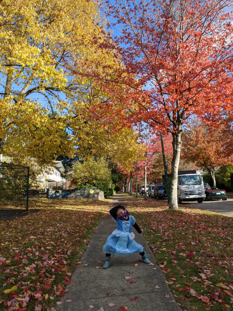 Nhìn dáng đứng của Cinderella, cô Lê đoán là công chúa nhỏ không nhảy parade mà đang nhảy rap việt đúng không. Cô rất thích chiếc áo đầm mà con chọn mặc để hóa trang. Công Chúa nhỏ biết màu cô yêu thích là gì không, là màu xanh đấy nên trang phục của cô, cũng hầu hết là màu xanh.