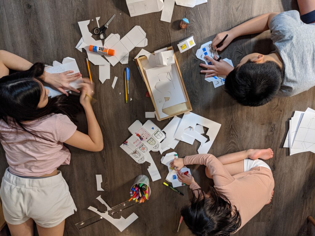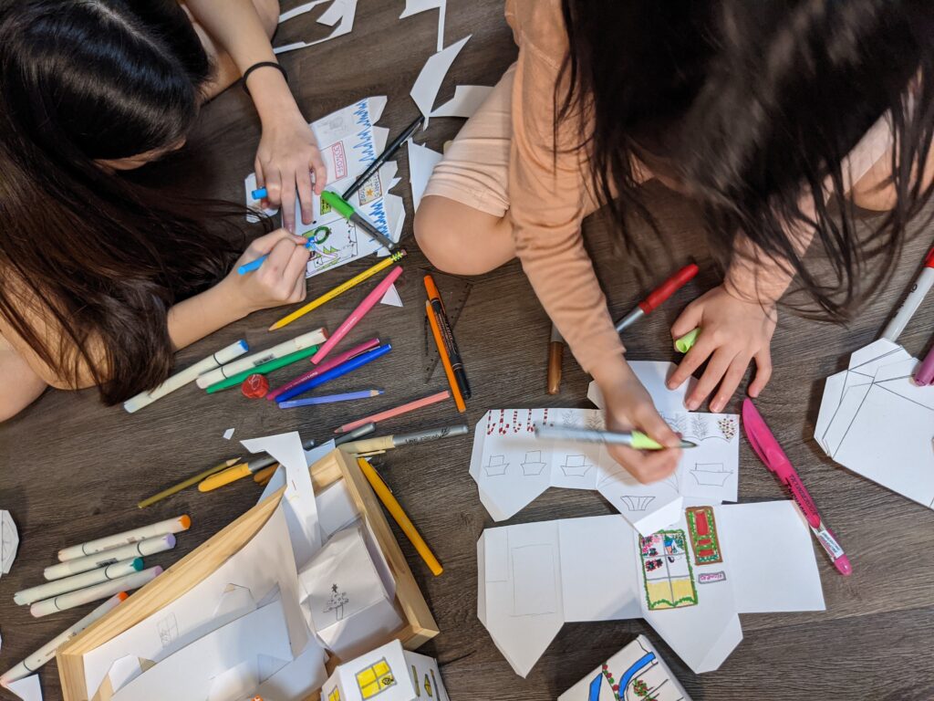 Sau khi vẽ được 4 mẫu nhà khác nhau, chúng tôi photocopy ra nhiều bản hình mẫu khung để đưa cho S cùng cắt và vẽ. Bước vẽ là bước vui nhất luôn! Tôi vẽ được 5 cái nhà rất đẹp, Z cũng có nhiều ý tưởng thú vị và S thì vui vui vẽ được nhiều nhà rồi lại đi ra chơi “Horsie”. Mẹ cũng giúp tôi và Z làm những mẫu nhà và vẽ luôn!
