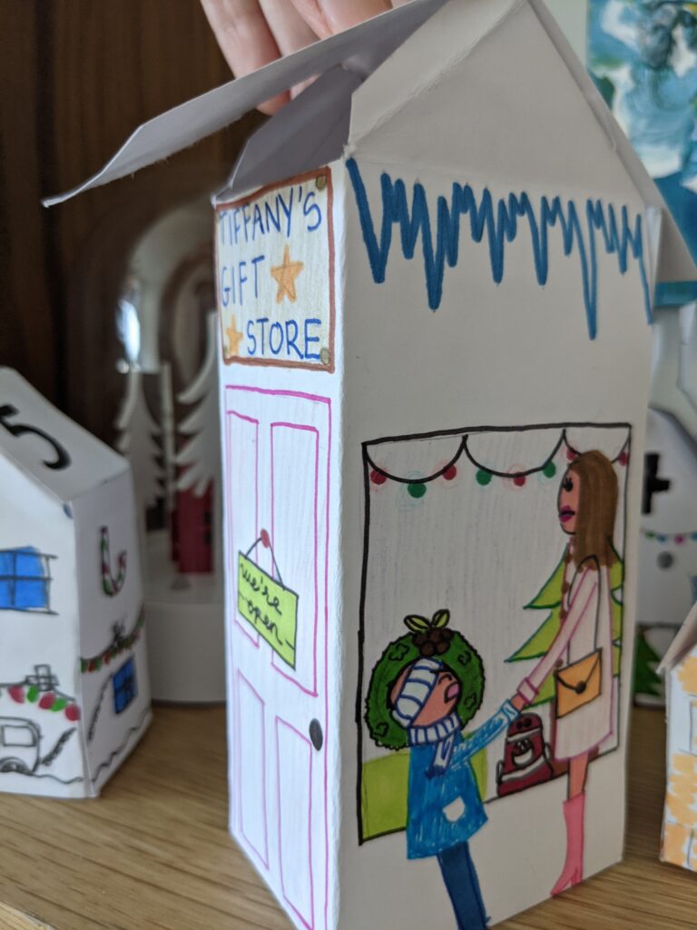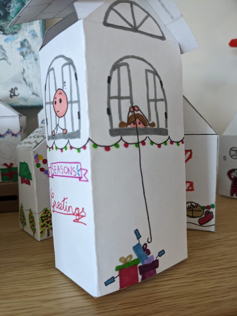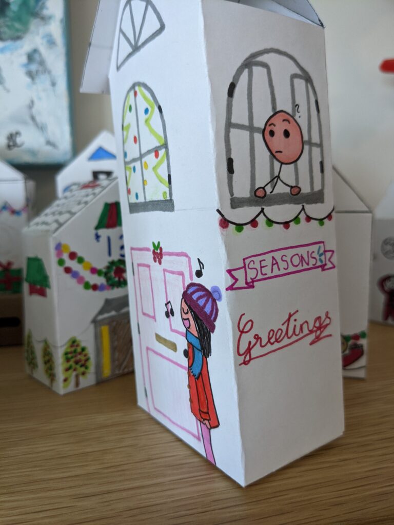 Đây là một trong những ngôi nhà mà tôi đã vẽ và tô màu! Trong hình bên trái, có một cô đang đứng trước của nhà, hát những bài Nô-en và một chú đang ngó ra ngoài cửa sổ. Bên phải có một cô bé nhỏ đang câu trộm những món quà sau nhà.