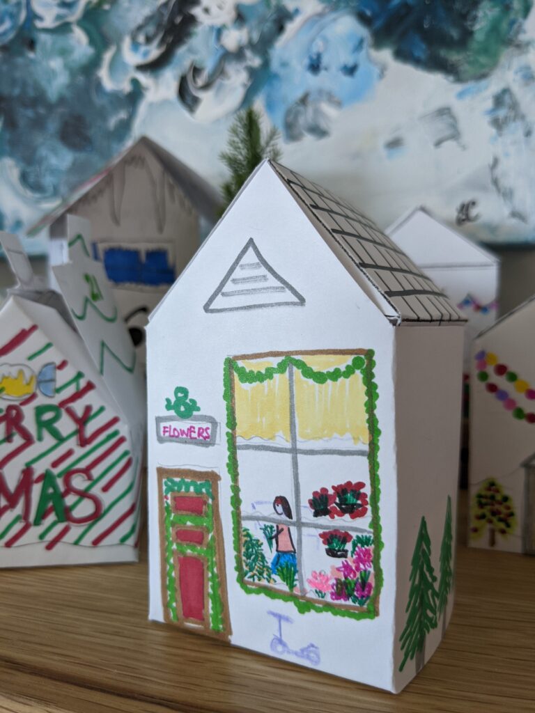 - Cắt xong rồi sẽ vẽ trang trí những ngôi nhà xinh xinh