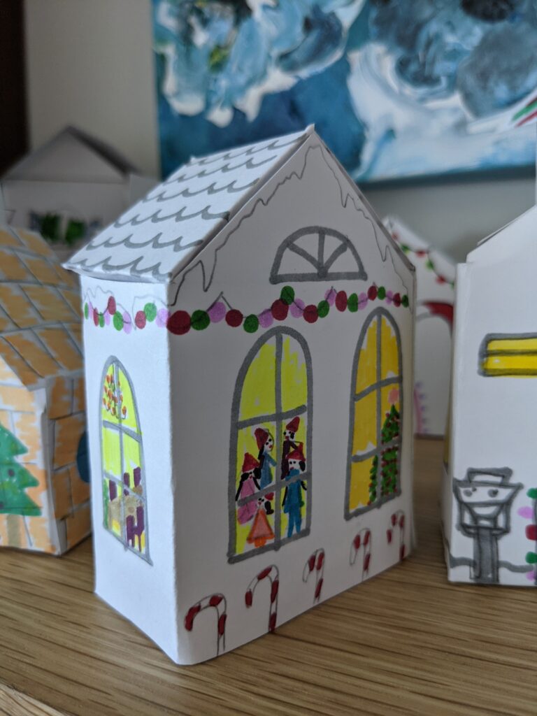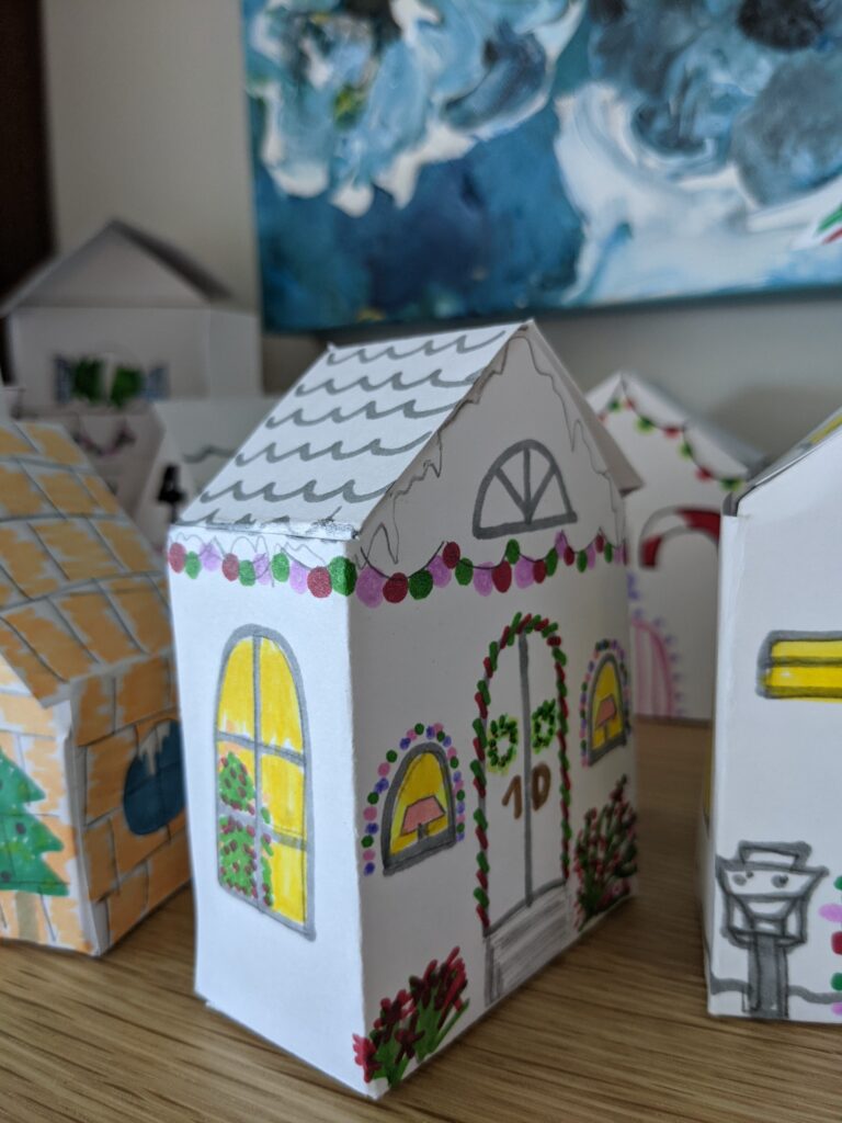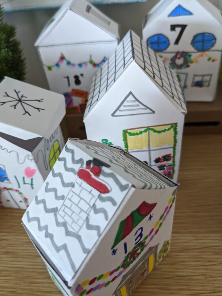 Năm nay, gia đình tôi quyết định là sẽ tự làm lịch mùa vọng với những ngôi nhà nhỏ bằng giấy và đánh số từ 1 – 24 để thành cái Advent Calendar. Cả 24 mẫu đều khác nhau hết!