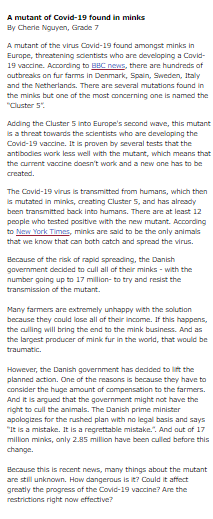 Kỳ đầu tiên của năm học, tôi đăng ký câu lạc bộ viết báo của trường! Tôi nghĩ mình cần phải học thêm cách diễn đạt và miêu tả tốt hơn, nên tôi đã đăng ký. Vào đầu tháng 11, tôi viết một bài báo về: Covid-19 trong những con chồn.
