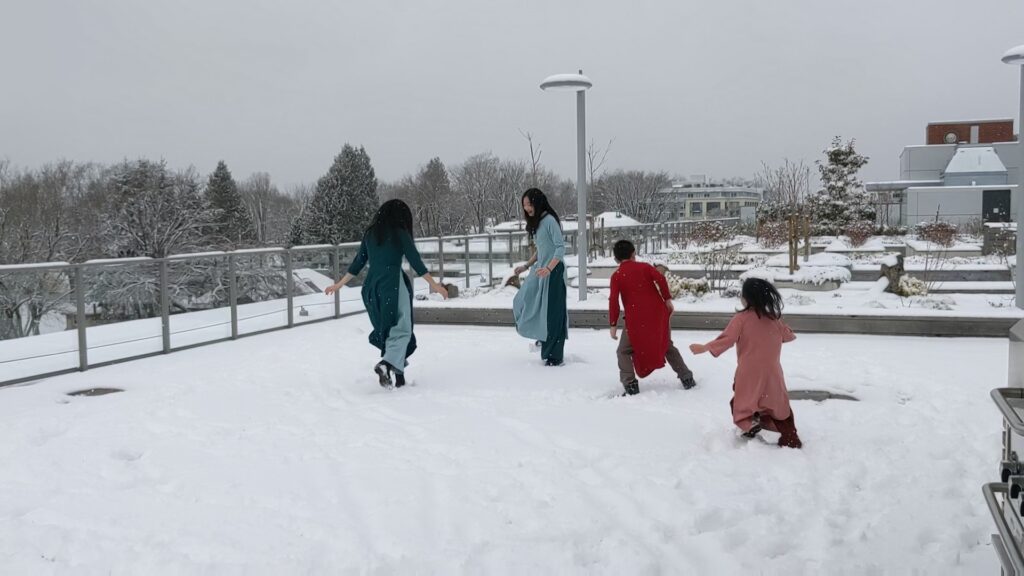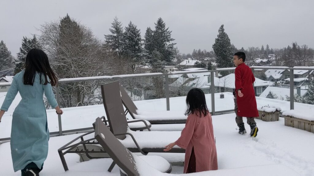 Ngay lập tức, gia đình tôi chạy ra ngoài để chơi với tuyết và chụp thật nhiều hình ảnh selfie. Vừa mặc áo dài, vừa chơi với tuyết! Mặc dù là tuyết rất lạnh, và áo dài không ấm, nhưng gia đình tôi vẫn ra ngoài chơi. Thật khác lạ và đúng là một trải nhiệm đặc biệt! Mẹ chụp quá nhiều hình nên điện thoại của mẹ hết bộ nhớ luôn! Về nhà, mẹ mất rất lâu để xóa bớt hình để có thêm bộ nhớ. Thật buồn khi phải nói tạm biệt với vài bức hình ảnh :(( .