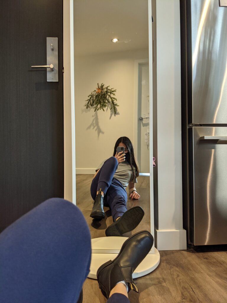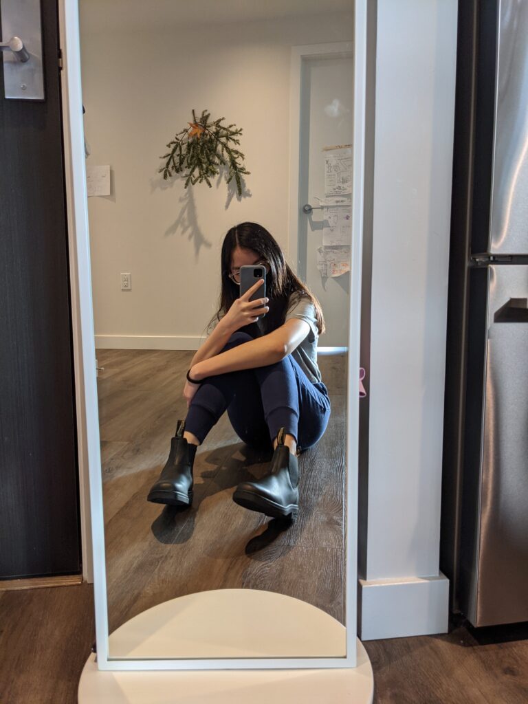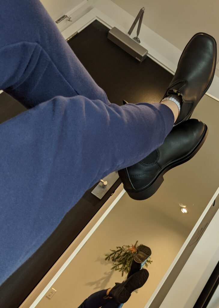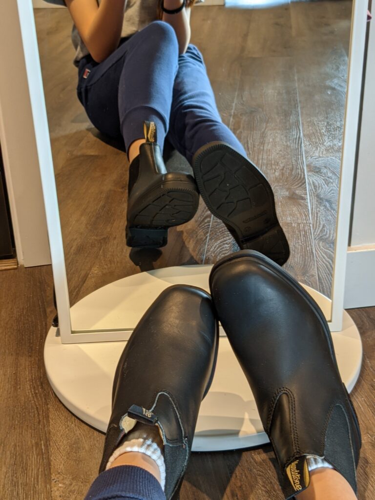 Trong các loại giầy khác nhau, tôi đã chọn để mua giầy Blundstones bởi vì nó chụi được thời tuyết tốt. Nó có thể đi vào những ngày tuyết, ngày mưa, ngày bão và tất cả những loại thời tiết khác nhau. Nó cũng rất nhẹ, nên đi không hề nặng nề. Giầy Blundstones có nhiều loại dáng và màu khác nhau, nên tôi đã phải suy nghĩ rất lâu thì mới có thể chọn được một đôi ủng đẹp nhất. Cho giầy Blundstone, có hai loại hình dáng cho mũi giầy. Có hình dáng tròn hoặc vuông. Tôi đã chọn hình dáng vuông là vì tôi thấy nó kiểu ‘tối giản’. Mặc dù tôi đã chọn giầy màu đen, tôi nghĩ rằng màu nâu sẽ hợp với cưỡi ngựa hơn. Tôi đã mua giầy màu đen vì vây tôi có thể vừa đi cưỡi ngựa vừa đi học được.