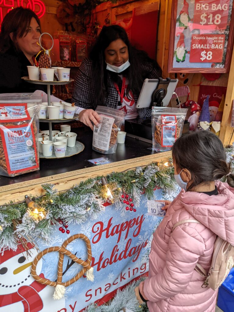 Ở chợ giáng sinh, có bán nhiều đồ ăn truyền thống của Đức. Đồ ăn nổi tiếng nhất là bánh quy xoắn pretzels! Có 2 quầy bán bánh pretzels rất ngon: Those Pretzels và Mr. Pretzel. Cũng có bánh Stollen, một loại bánh phổ biến vào mùa giáng sinh. Một loại đồ uống phổ biến cho dịp giáng sinh là Gluhwein. Gluhwein có rượu, nên chỉ những người trưởng thành được uống thôi. Có một đồ uống giống Gluhwein để dành cho trẻ em gọi là Kinderpunsch. Tôi đoán rằng nó là nước ép nho.