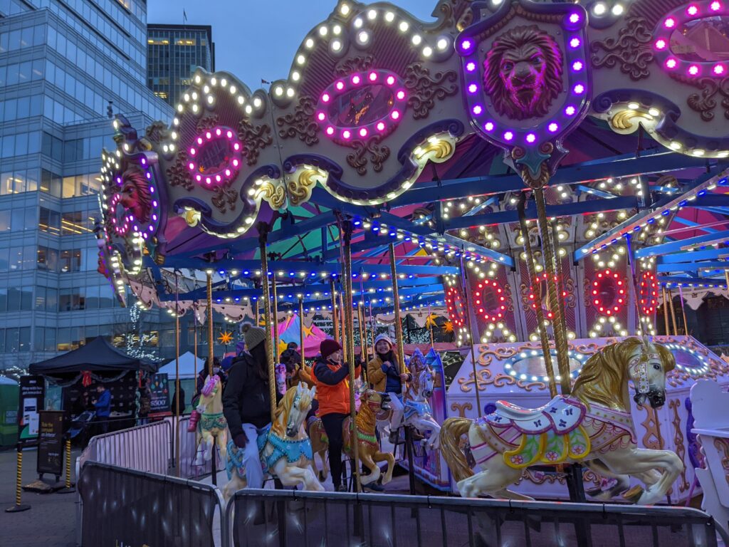Lúc bước vào chợ giáng sinh, có một vòng xoay ngựa gỗ. Tất nhiên, S bé nhất nên thích trò này nhất. Em đã rủ tôi và Z để đi cưỡi ngựa gỗ cùng em ;). Cái vòng xoay được trang trí nhiều đèn màu sắc rực rỡ. Khi nó xoay, có nhạc nền thật vui tươi và sôi động. Có rất nhiều những em nhỏ (ví dụ: S.) đi cưỡi ngựa gỗ, và một ít người lớn đi kèm luôn.