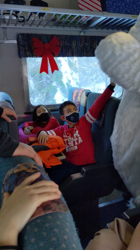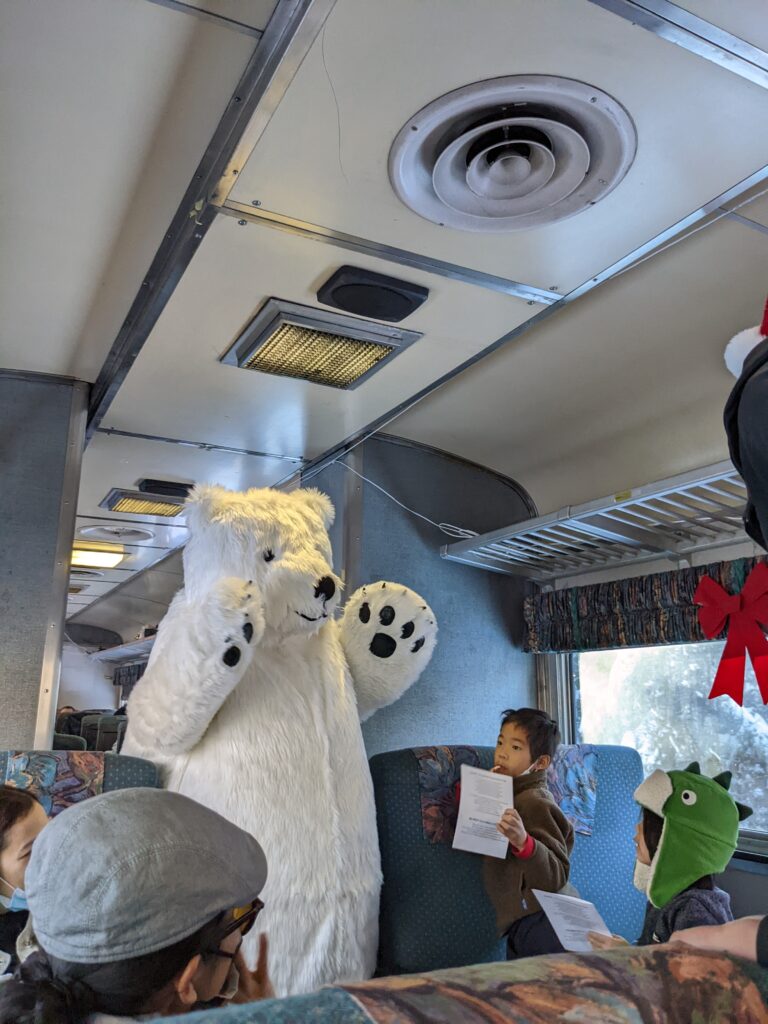 so in the middle of the ride, guess what! A polar bear came on the train. Literally a POLAR BEAR like not a real one but yeah, a POLAR BEAR. Really! just try to imagine THAT a polar bear going on the train. Isn’t that just crazy! can you think about It. Like a polar bear going across the train!?! Okay, that’s enough of “polar bear talk” now there’s a another two small photos!