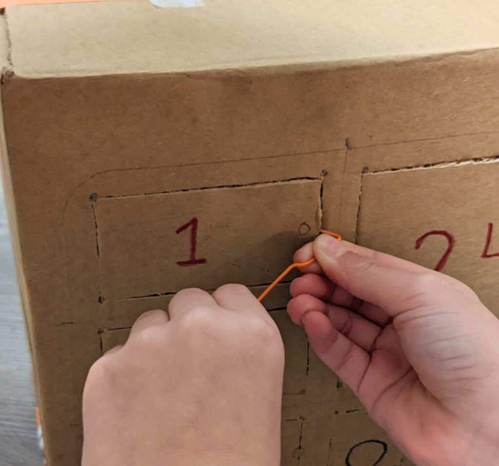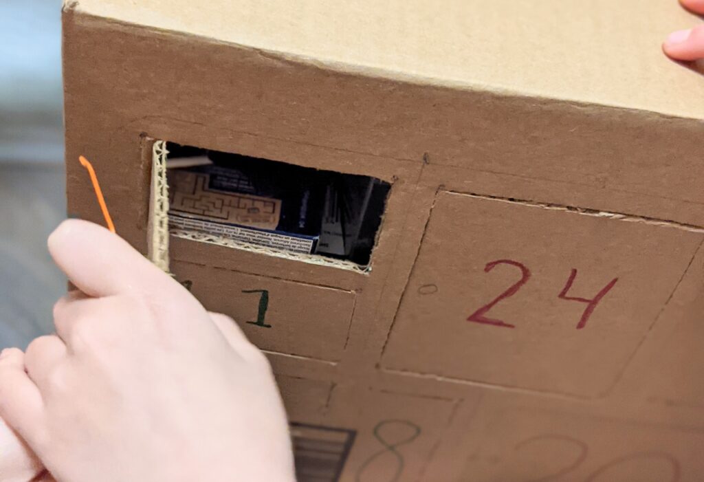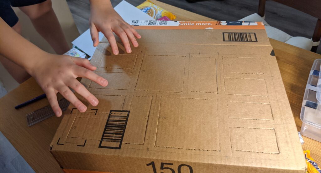 - Put the tray on the outside of big cardboard box. Trace all the equal squares so we know where the doors should be.