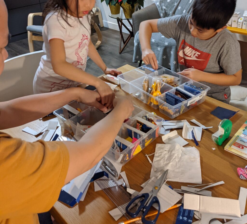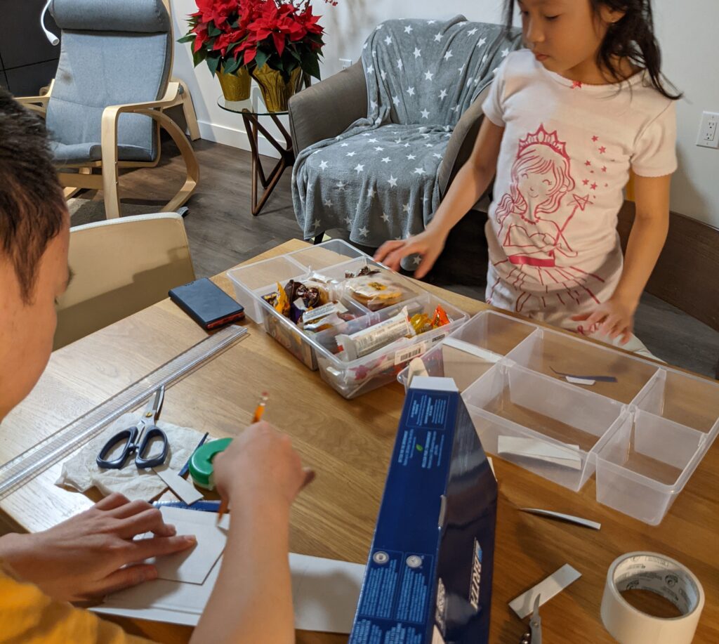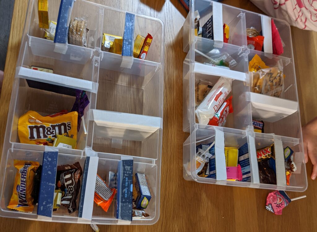 - put the treats in each divided squares so when you open it, it has candy in it, if you don’t get candy that’s bad :((