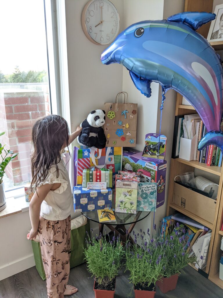 So, I will tell you about my real birthday now. First in the morning I woke up at 7:15 to decorate the house, I bended my toys in to a S shape. I found all my birthday cards and put them on my sofa with a teddy bear. Then I put books on one table and paper and pencils on the other. And I put all my presents (STILL WRAPPED) on another table.