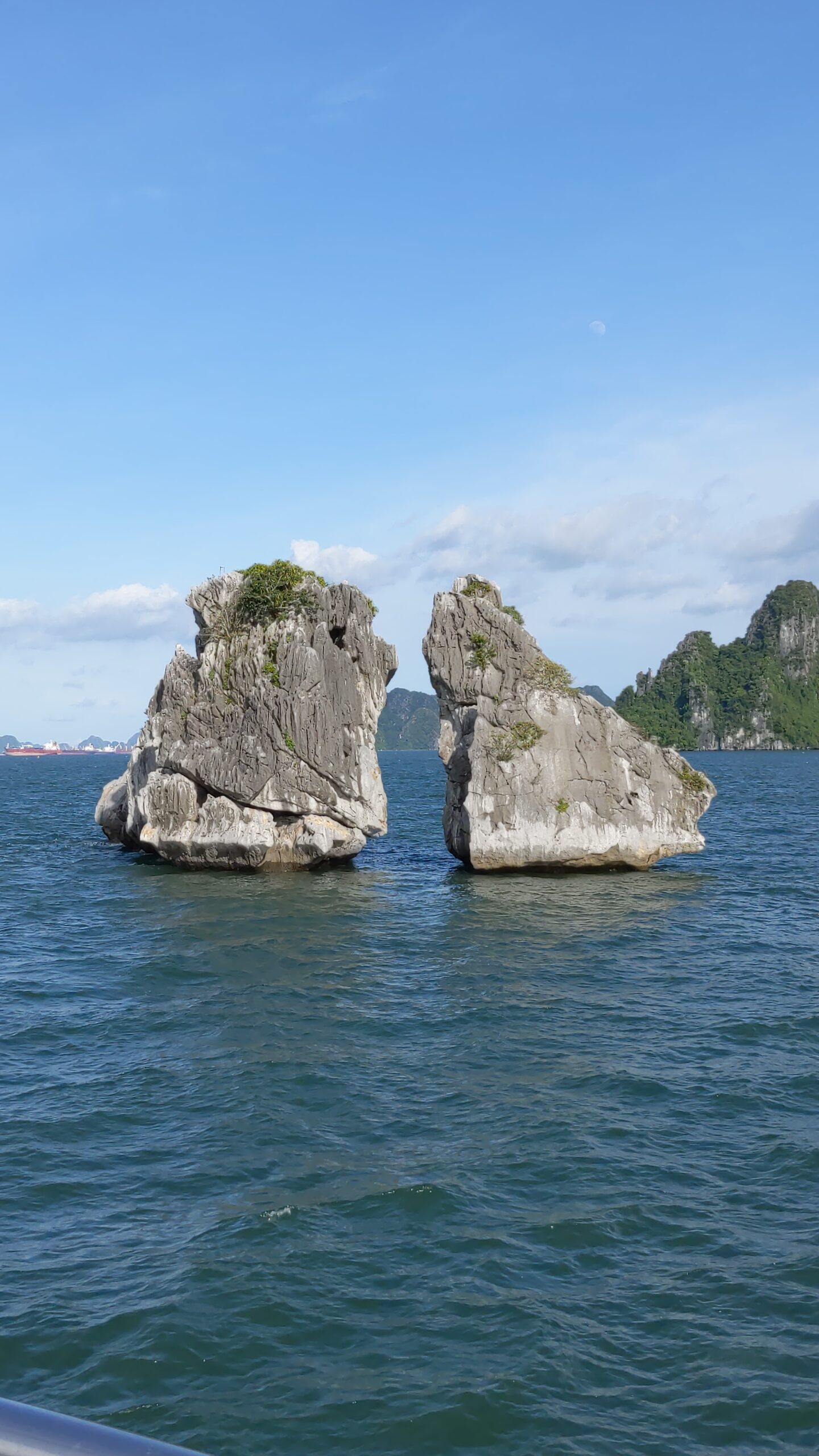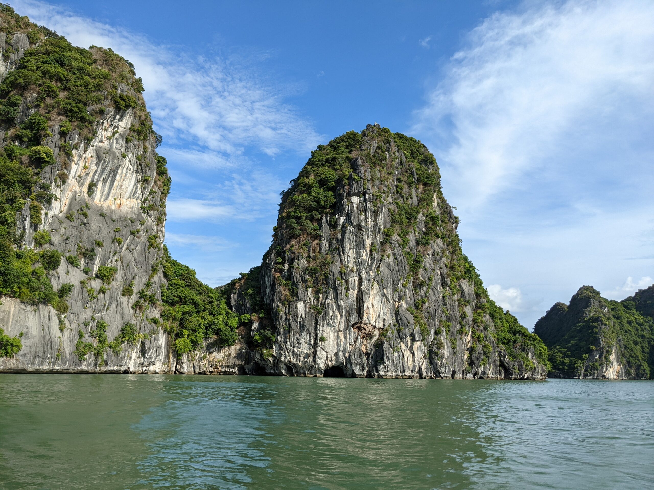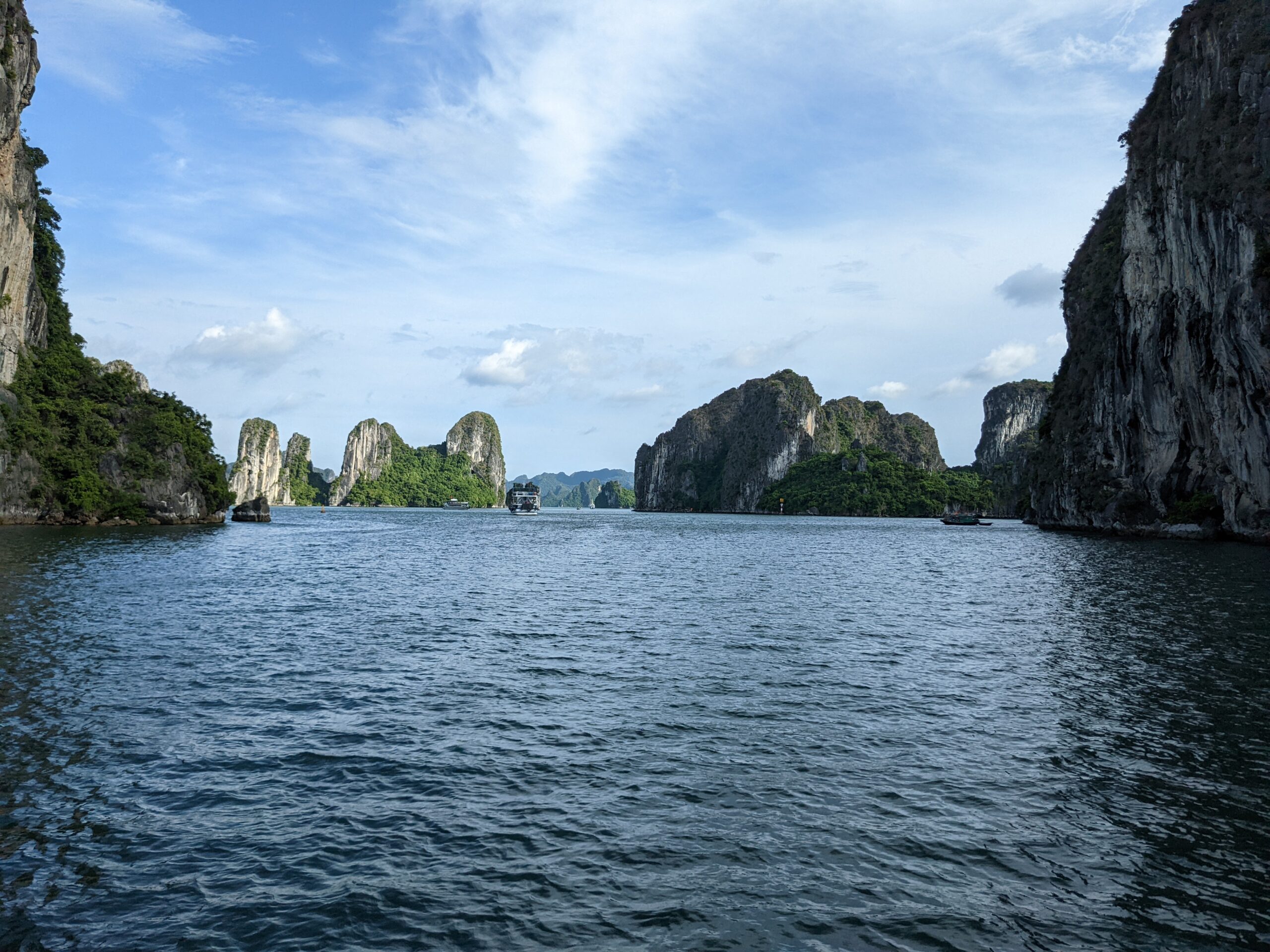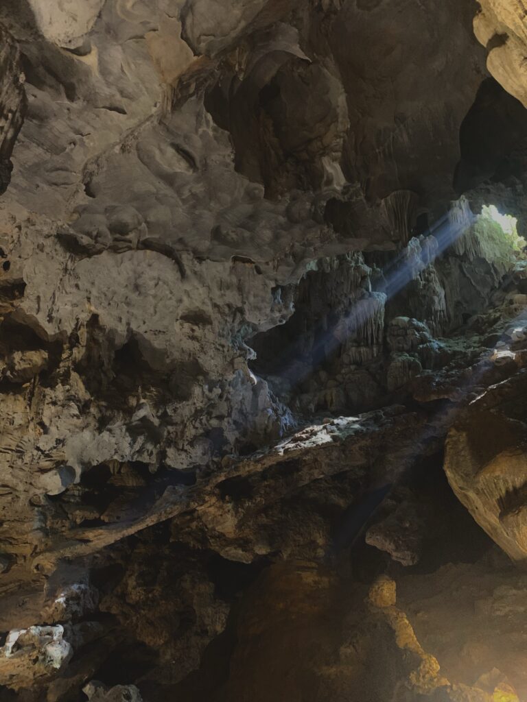 Trong tuần cuối cùng ở Việt Nam, gia đình tôi đã quyết định đi một chuyến Hạ Long! Trước đây, tôi mới đi Hạ Long được một lần, nên tôi cũng thấy hồi hộp khi được trở lại. Những hòn núi là một cảnh vô cùng đẹp. Những hòn núi nhấp nhô trên mặt nước xanh ngọc. Chỉ ở Vịnh Hạ Long mới có cảnh đẹp như thế được! (Hạ Long là một UNESCO Heritage Site đấy!) Gia đình tôi đã thuê một cái tầu để đi thăm quan vịnh trong 3 tiếng. Trong chuyến đi, tầu có dừng lại ở một cái hang để mọi người đi thăm quan. Cái hang đấy ở trong một cái hòn núi, nằm giữa vịnh. Đấy là lần đầu tiên tôi được thăm quan một cái hang, nên khi vào tôi thấy thật bất ngờ và ngỡ ngàng. Tôi không nghĩ là bên trong sẽ rộng và cao tới vậy, và đá sẽ có hình kỳ lạ như thế.
