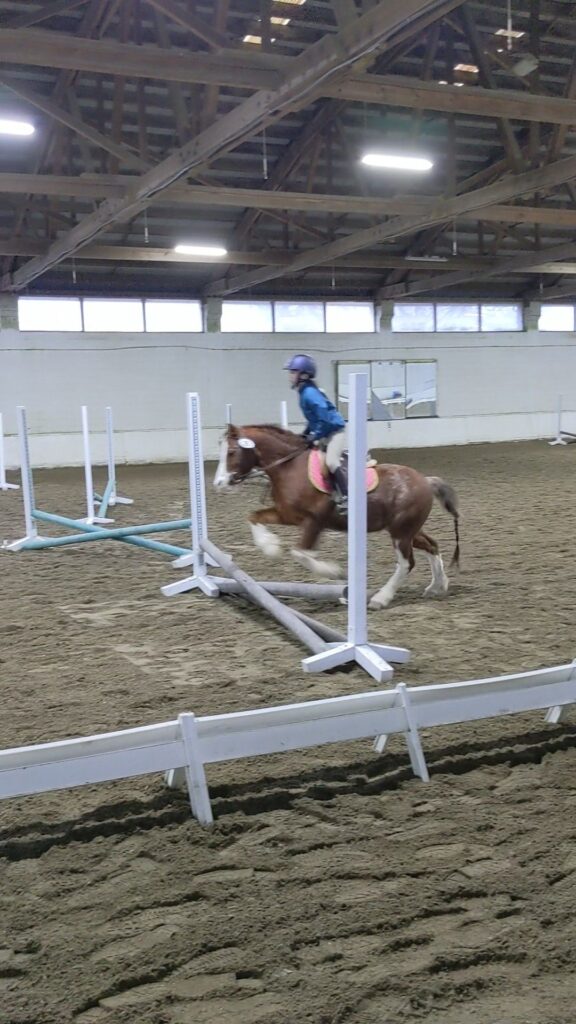 Okay, now it’s time for my second class! It’s a course of cross rails, I LITERALLY HAVEN’T JUMPED SINCE LAST YEAR (it’s February). Okay, at least I’ve jumped a lot on this pony, (I haven’t ever jumped on the pony I was supposed to ride. Okay, so for this class, it’s one at a time, so they don’t give you whatever place, they just give you a ribbon for completing the course.