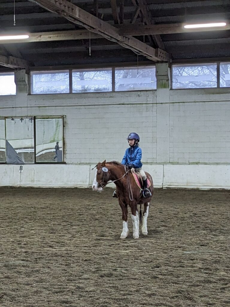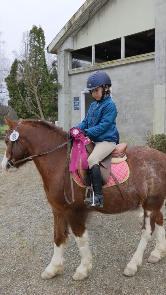 So, after a little while, watching the last minutes of the previous class, it’s time for MY CLASS! Okay, now I have walked into the show ring. And I’m not scared. Like, if you’re in there you’re in, there’s no getting out! I was so excited. The stirrups were too short, because the previous rider had shorter legs, but then my coach made it too long, and then, blah blah stirrup chaos. So I headed out to the rail and started walking, the pony is very forward, good. “Trot, please trot.” I squeeze, and he picks up the trot. He picked it up really quick and I got the right diagonal from the start, I have a good body position and then, “Walk, please, walk.” Now we walk again. Okay, all good so far! :))) I’m safe! Okay, now for the canter part. I line up and watch the first people canter. I noticed that their canter wasn’t so smooth. Like, they weren’t staying in the saddle.I’m actually very happy I had a very smooth horse. In my head, I already knew I would be 1st. Okay, now my turn. I go to the rail and then “Trot, please, trot!” So I trot, “Canter, please, canter!” she says, my pony picked up the canter pretty quick, I stayed in the saddle, and kept the canter going. I am pretty sure I’m going to be in 1st place now. I trot, then walk, then change direction. The judge literally said, “Good Job!”!! I changed direction and I’m not sure what he will do on this rein. I trot, then I ask for a canter. But he doesn’t pick up the canter!! I was trying sooo hard, it took a long AND short side to pick up the canter. Luckily I was on the opposite side of the other rider and so they weren’t looking at me, they told me to canter again, and luckily he picked it up really quick! YAY! I sat the canter and she said “Good Job!” AGAIN!!! I did so well! I trotted then walked and ribbon time!! We lined up. It was so thrilling because everyone’s number started with 80-something, and so it would be”Fifth place to 80… Fourth place to 80… Third place goes to 80…” TOP 3. Expected. Okay, this is SO scary “Second place…” He walked towards me, stopped at me, “Goes to 80…” NOT MY NUMBER. He continued walking and stopped to the person next to me. WHAT! I AM IN FIRST PLACE. “First place goes to number 88.” YESSSS!!! I recieve my ribbon and I get a Hershey’s kisses. I grab one, but it slips out of my hands and so I have to grab one while he’s walking away! I ride out and my mom takes countless photos of me.