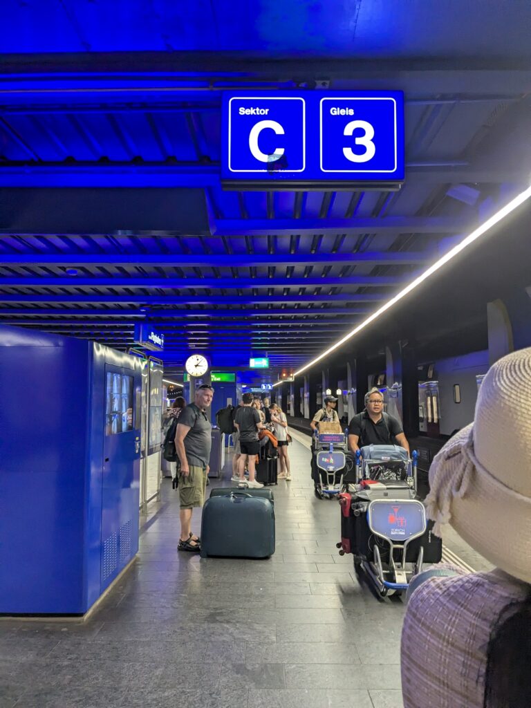 Việc đầu tiên làm ở đó là đi bộ trong trung tâm của thành phố Zurich. Trước khi vào thành phố, mình phải tìm cách để đến từ sân bay đến trung tâm thành phố và ở Thụy Sỹ có một giải pháp rất đơn giản. Đó chính là tàu. Hệ thống tàu ở đây rất dễ hiểu, đơn giản, sạch sẽ, an toàn va nói trung chỉ hoàn hảo. Bởi vì mẹ mua vé theo ngày nên tôi được đi cùng với mẹ miễn phí nếu chả 30 CHF trước. Sau khi lấy được vé trẻ em cho tôi, đến giờ đi tim bến tàu để đi được đến trung tâm. SBB là công ty quản lý tất cả các phương tiện đi lại công cộng ở Thụy Sỹ và họ thiết kế ra một app để tim đường đi bằng phương tiện công cộng của họ. Nó bao gồm cả tàu, xe buýt, thuyền và mọi thứ còn lại. Tôi rất thích dùng app đó bởi vì nó hiện ra tất cả các thông tin cần thiết như là bến tàu, thời gian, chỉ đường và còn đưa mình nhiều phương án nếu càn thiết. Nhưng, khi vừa đến Thụy Sỹ xong, tôi đang không quen với mọi thứ nên không biết bến tàu đúng ở đâu. Thật là đơn giản, chỉ cần việc đi hỏi ai đó thôi. Nhưng, có một vấn đề nhỏ. Nó là tôi đang ở Thụy Sỹ, và ở Thụy Sỹ, người ta nói tiếng Đức. Đương nhiên tôi biết nói tiếng Đức nhưng tôi chưa bao giờ dùng nó ngoài đời thật nên tôi hoàn toàn không tự tin. Cuối cùng tôi không hỏi và may quá tìm được bến tàu đúng và đến được trung tầm.